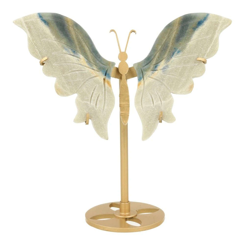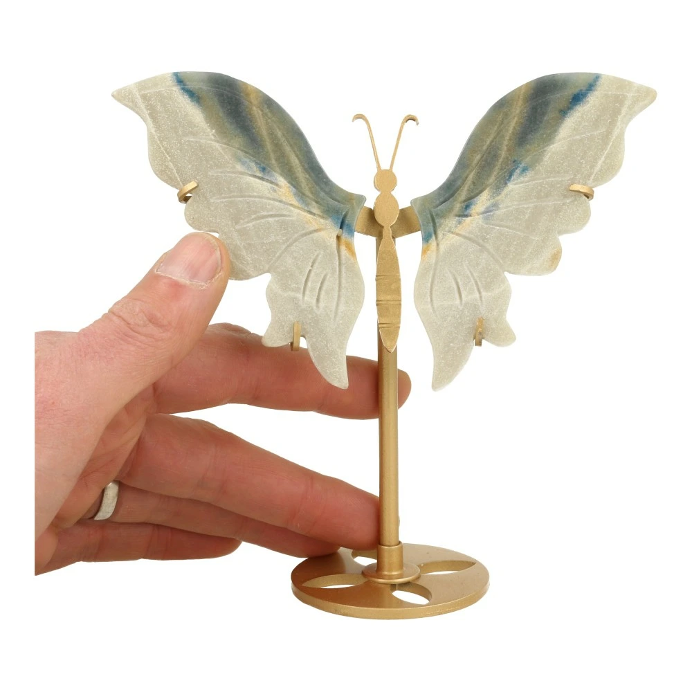 Fijne trolleiet vlinder (of trolleite in het Engels) op goudkleurige metalen standaard. Je ontvangt de trolleiet vlinder van de foto, de vleugels zitten los in de standaard. De afmeting van deze trolleiet vlinder op standaard is ongeveer 15,5cm breed en 15cm hoog. Een bijzondere steen met fijne, zachte energie en vriendelijke uitstraling.