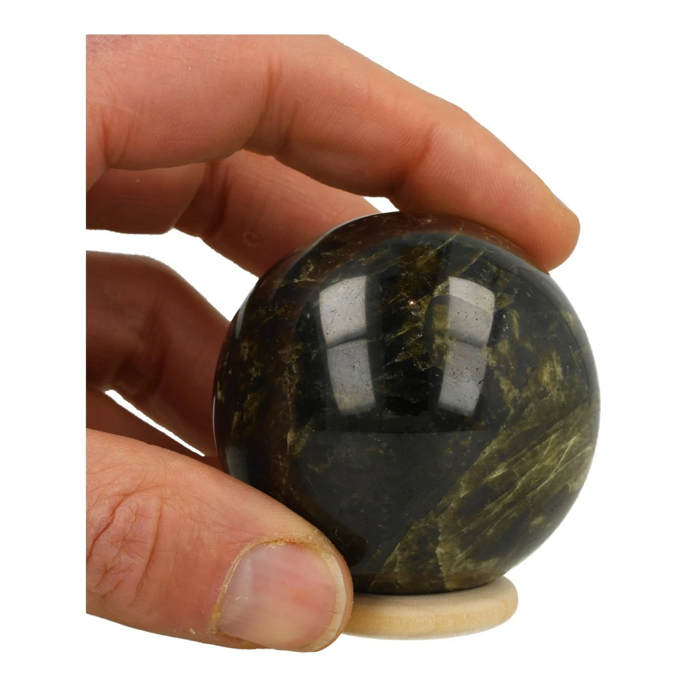 Prachtige en zeldzame tsavoriet bol (groene granaat / grossulaar uit Tanzania) met een diameter van circa 58mm op een houten ring. De kleur varieert van licht tot diep mosgroen en straalt een zachte, maar tegelijkertijd krachtige en aardende energie uit. Een bijzondere steen die direct een gevoel van levenskracht en harmonie oproept.