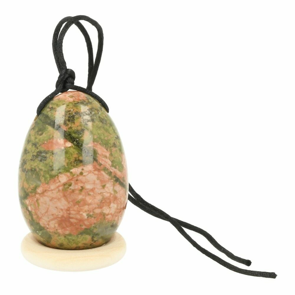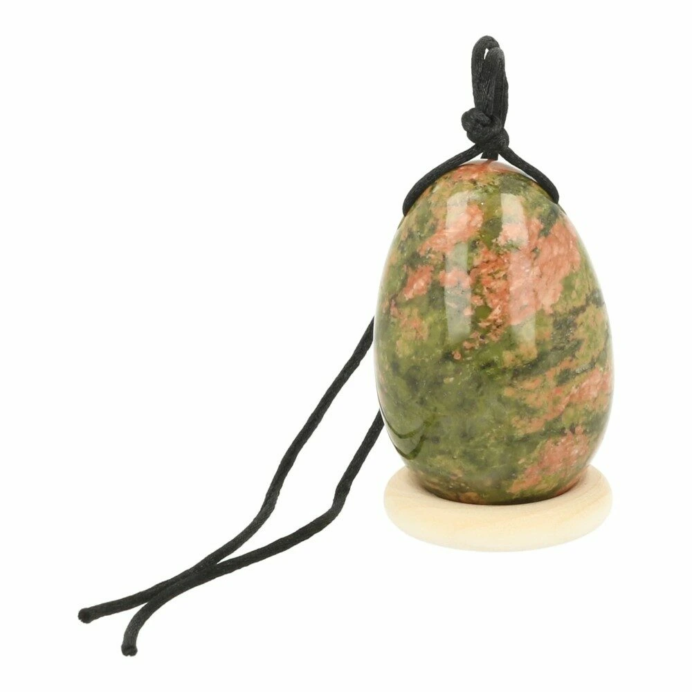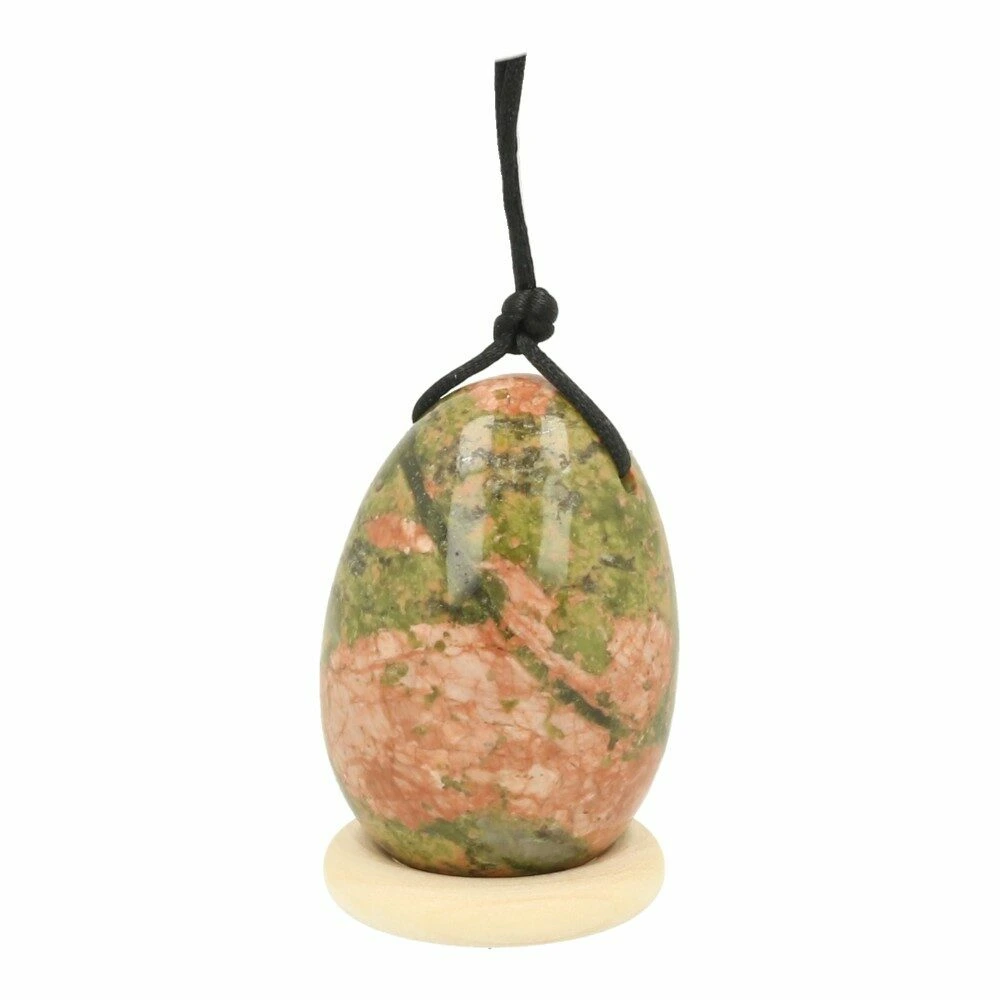 Fijn bruin-groene unakiet yoni ei van 45mm hoog en een diameter van 30mm op houten ring. Het gaatje dient om een touwtje door te doen als je dat prettig vindt. Je ontvangt een soortgelijk unakiet yoni ei als op de foto, inclusief houten ring. Lees meer over het gebruik van yoni eieren op de pagina yoni ei.