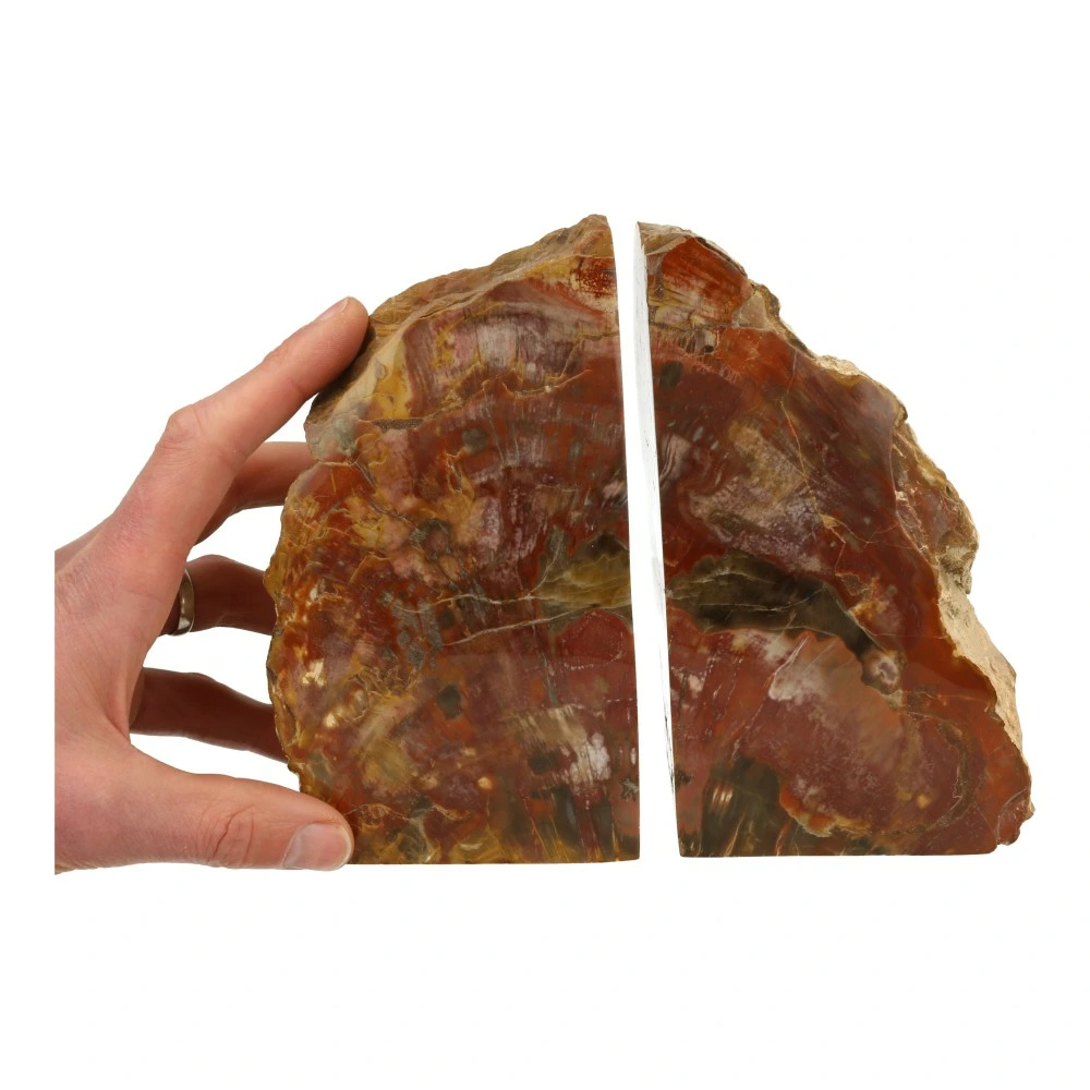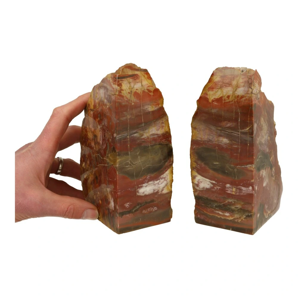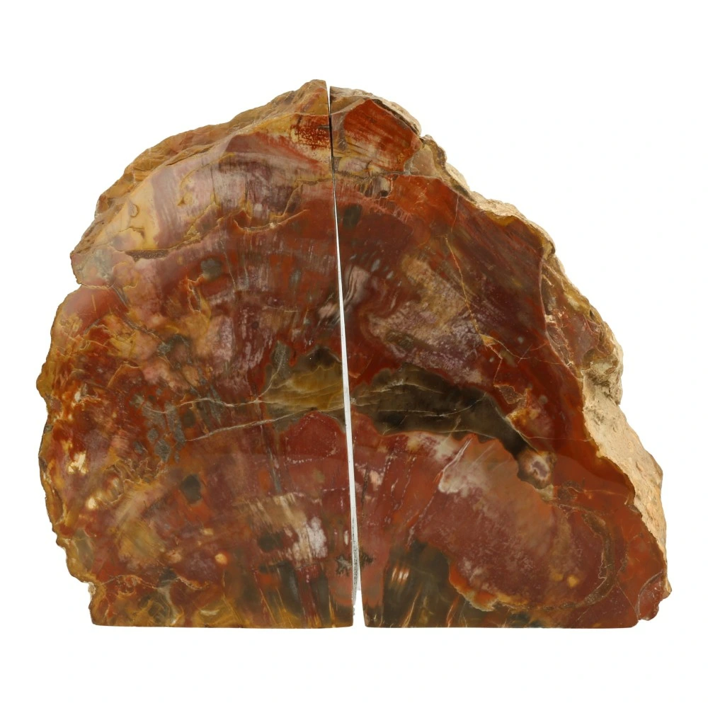 Fraai getekende versteend hout boekensteun uit Madagaskar. Dee boekensteun is gemaakt van een dikke plak versteend hout. De afmeting van ieder stuk is ongeveer 10cm breed, 18cm hoog en ruim 7cm dik. De voorzijde en binnenzijde is fraai gepolijst, de achterzijde is nog ruw. Versteend hout is fossiel geworden boomstam van miljoenen jaren oud. Ieder stuk is daardoor uniek in vorm, tekening en kleur. Deze grote boekensteun is door zijn gewicht en grootte ideaal voor een grotere rij boeken. Je ontvangt de versteend hout boekensteun van de foto.