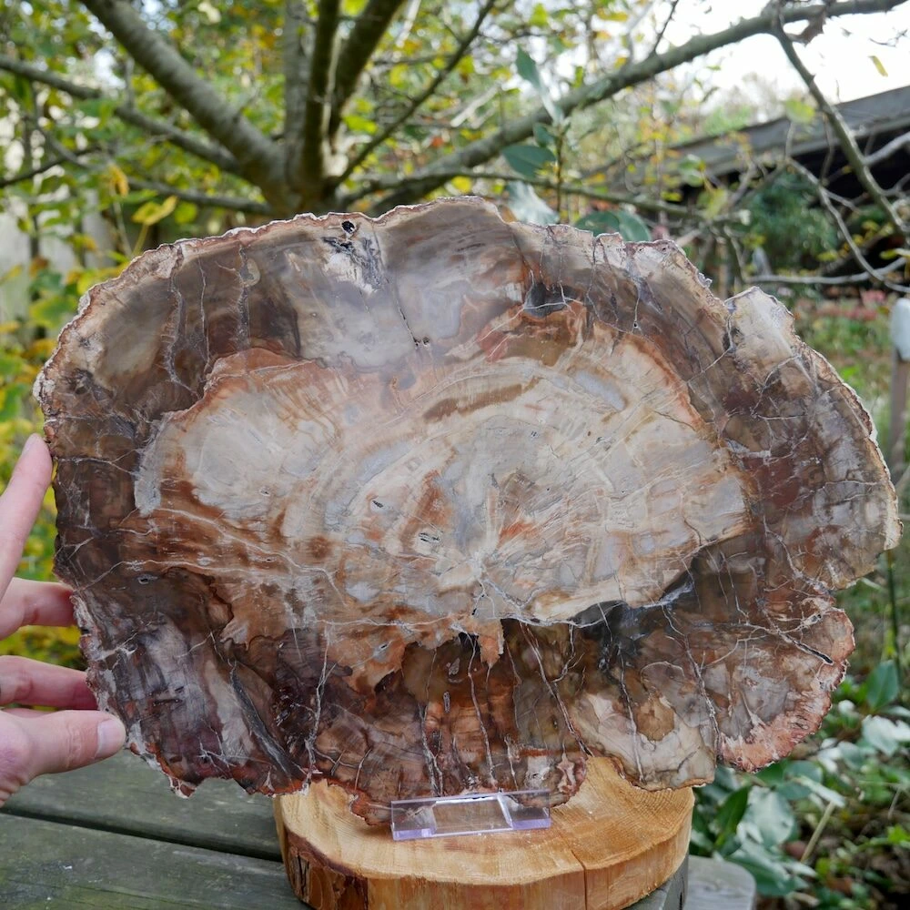 Fraaie versteend hout schijf groot met een afmeting van 42cm lang, 29cm hoog en 2cm dik uit Madagaskar. Echt een uniek stuk met hele mooie kleuren, inclusief standaard zodat je deze rechtop kunt neerzetten. De schijf is aan beide zijden fraai gepolijst, dus je kunt kiezen welke kant je aan de voorzijde neerzet.