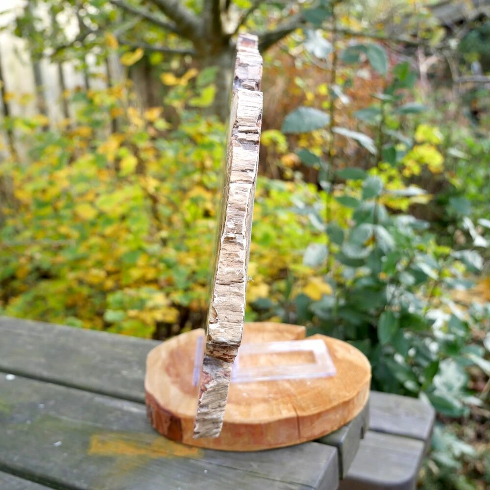 Versteend hout is fossiel geworden boomstam van miljoenen jaren oud. Je ontvangt de schijf van de foto met schuifstandaard.