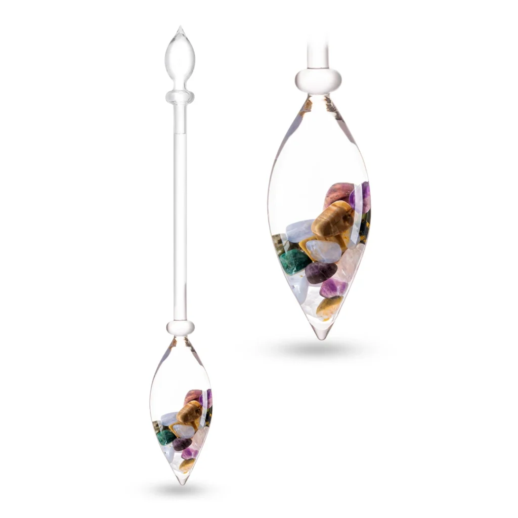 Deze bijzondere edelsteenstaaf is met de hand vervaardigd door meester-glasblazers in Bohemen, volgens een traditioneel en ambachtelijk proces. Het glazen buisje is gemaakt van loodvrij glas en gevuld met zorgvuldig geselecteerde, natuurlijke edelstenen.