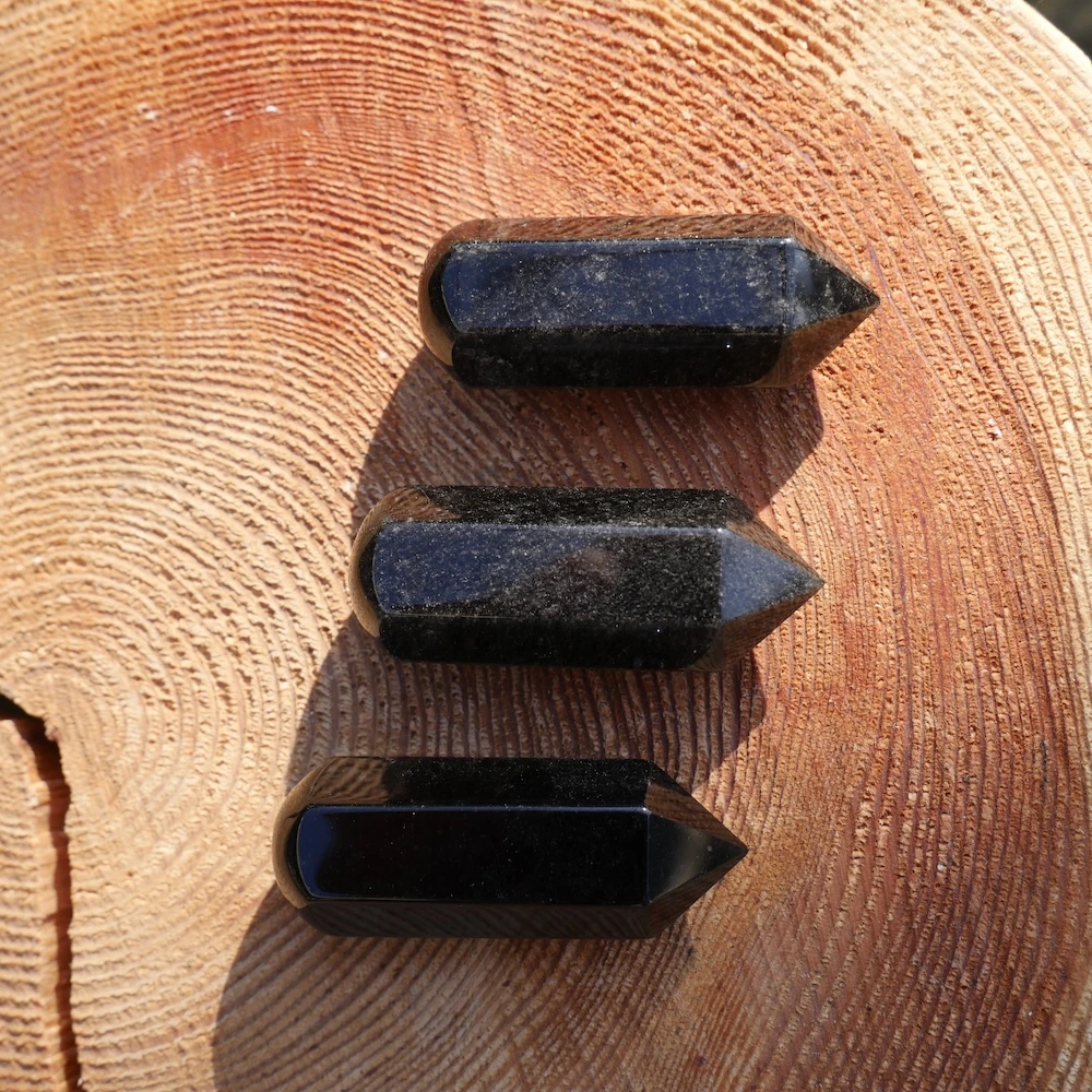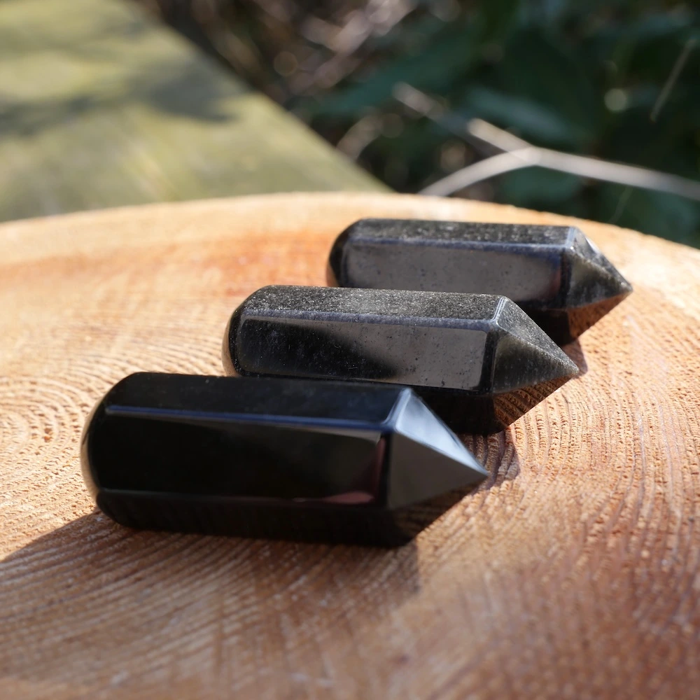 Mooie zwarte met zilveren glans obsidiaan massagesteen van circa 5cm lang en 2cm hoog en diep. Deze zeshoekige massagestaaf heeft een bolle onderkant en spitse punt, zodat je zowel de spieren kunt masseren als meridiaanpunten kunt stimuleren. Je ontvangt een soortgelijke zilverglans obsidiaan massagestaaf als op de foto.