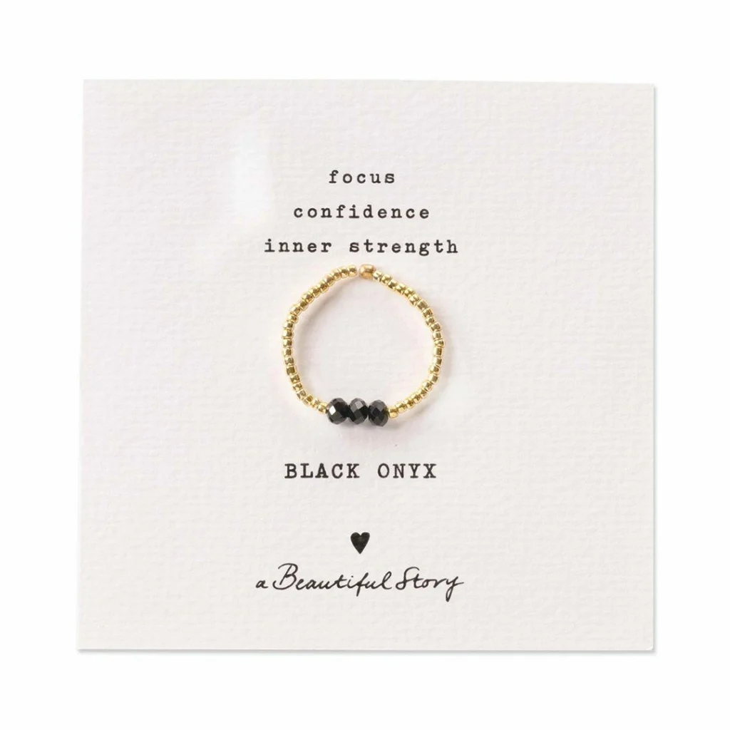 Ontdek de Clarity Zwarte Onyx Goudkleurige Ring. Deze ring heeft 3 zwarte onyx edelstenen en goudkleurige kralen. Perfect om te combineren met je andere lievelings sieraden of om op zichzelf te laten stralen. A Beautiful Story edelsteen sieraden geven betekenis en begeleiden je op je pad. De kralen van de ring zijn geregen op rekbaar koord.