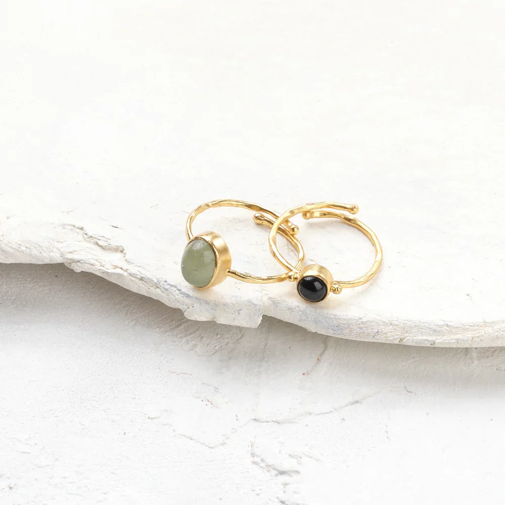 Ontdek de Faithful Zwarte Onyx Vergulde Ring van A Beautiful Story. Deze mooie, handgemaakte ring is gemaakt van verguld messing en heeft een zwarte onyx edelsteen. De ring heeft een standaard binnenmaat van 1.6 cm, maar deze is makkelijk verstelbaar.